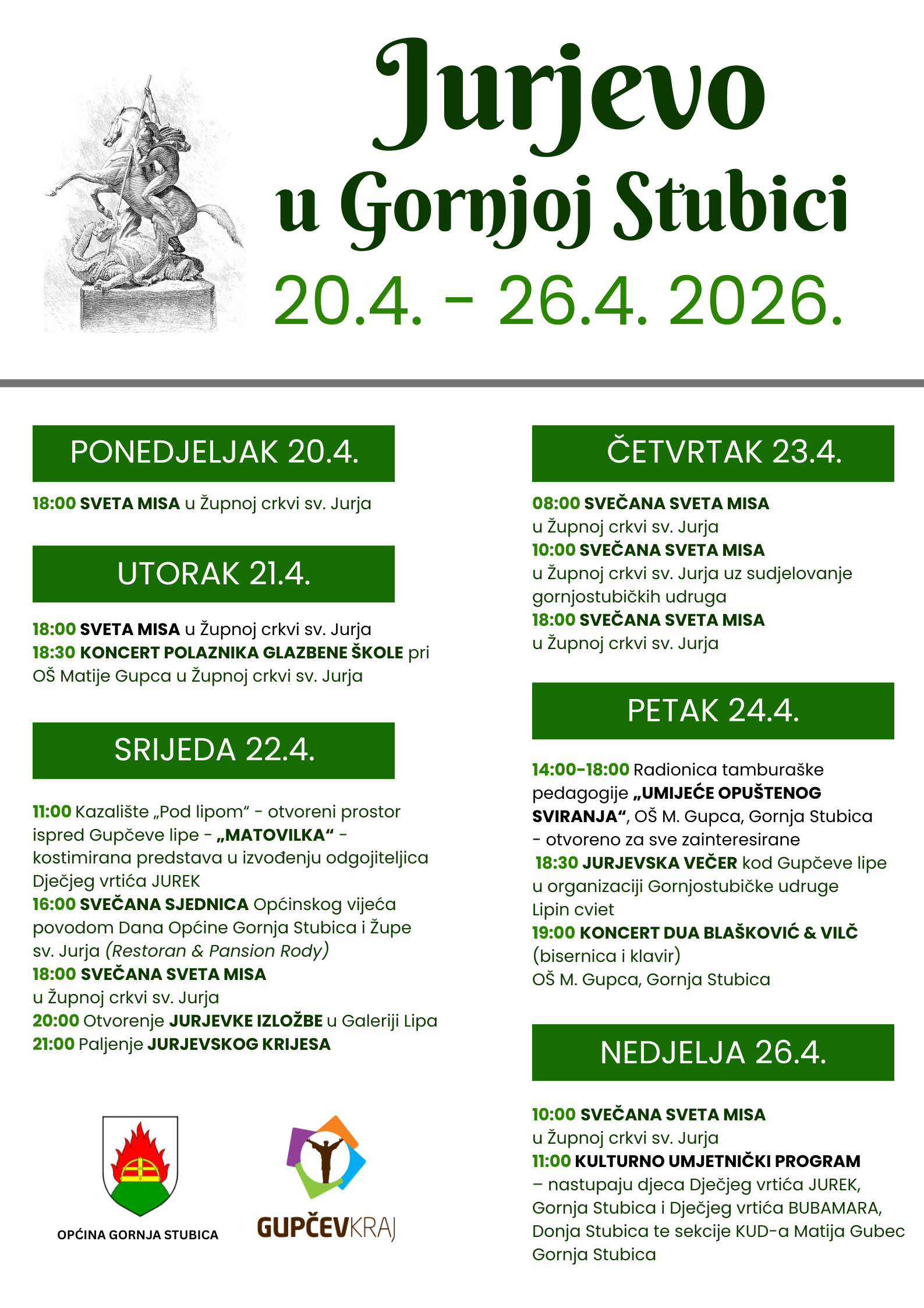 O programu: Jurjevo u Gornjoj Stubici je tradicionalna manifestacija kojom se obilježava Dan općine i Dan Župe sv. Jurja Mučenika. Slavi se svake godine oko 23. travnja i traje više dana. Program uključuje izložbe, poput tradicionalne Jurjevske izložbe u Galeriji Pod lipom, nastupe kulturno-umjetničkih društava, dječje folklorne programe, koncerte, misna slavlja te paljenje jurjevskog krijesa. Manifestacija okuplja brojne lokalne udruge, škole, župu, kulturna društva i građane, te je bitan događaj za promociju tradicije i kulture Gornje Stubice i cijelog Gupčevog kraja.