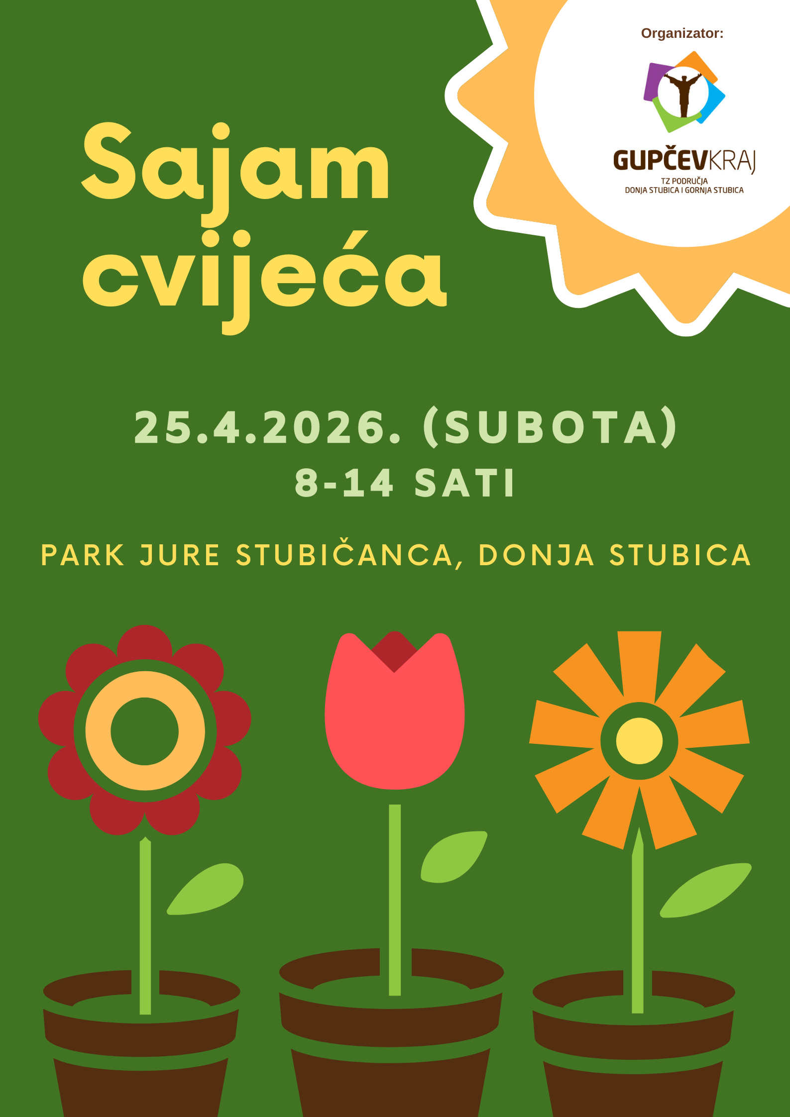 O programu: Sajam cvijeća u Donjoj Stubici je tradicionalna manifestacija koja se održava u Parku Jure Stubičanca. Sajam nudi prodaju sadnica cvijeća, začinskog i ljekovitog bilja, zemlje za cvijeće, humusa i bilja za vrt. Cilj sajma je potaknuti lokalno stanovništvo na uređenje okućnica, balkona i dvorišta. Na ovogodišnjem sajmu će izlagati OPG Razum, OPG Darinka Knezić, OPG Marković, OPG Mladen Težak, OPG Ivček  i OPG Silvija Grah. Posjetite sajam i odaberite nešto za sebe i svoj vrt!